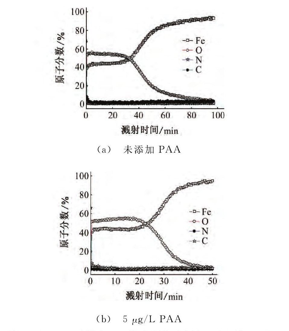 由图5可见,经2 000h高温腐蚀试验后,A508III试样在两种溶液形成的氧化膜的主要成分均为氧和铁。在不含PAA的条件下,氧化膜在溅射40min后,开始出现铁含量升高,氧含量下降趋势;而添加PAA后,氧化膜在溅射25min后,氧含量逐渐下降,这表明添加PAA后的试样氧化膜更薄,这主要是由于PAA的分散作用使得氧化物颗粒不易沉积在试样表面[5]。
