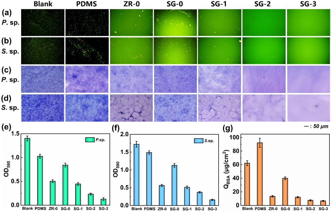图2 杂化涂层的透明性、硬度、耐磨及柔韧性 然而,硅基防污涂层在机械性能与防污性能间寻求平衡仍具挑战,为了解决这一问题,研究团队受高强韧“聚合物陶瓷”防污涂层的启发(J Mater Chem A, 2020, 8, 380−387; Adv Funct Mater, 2021, 31, 2011145; Adv Sci, 2022, 9, e2200268),巧妙地采用多种绿色防污策略协同组合的方式,设计了一种由亲水性聚乙二醇和N乙烯基吡咯烷酮单体、疏水性含氟单体、合成的抗菌小分子丙烯酰胺-苯并噻唑共聚而成的接枝抗菌分子的双亲性聚合物,随后与ZrO2溶胶及功能性硅烷通过简便的溶胶-凝胶法制备了表面具有双亲性和抗菌性的硅基硬质杂化涂层。 此涂层结合了刚性氧化锆结构与柔性长链调聚物,实现了高硬度、高耐磨性和柔韧性,同时具有良好的基底附着力。其表面的抗菌双亲性聚合物有效抑制了污损生物附着,展现了优异的自清洁性能和污损阻抗性能。该涂层在光学仪器、可折叠显示器及海洋设施装备等领域具有广阔的应用前景。