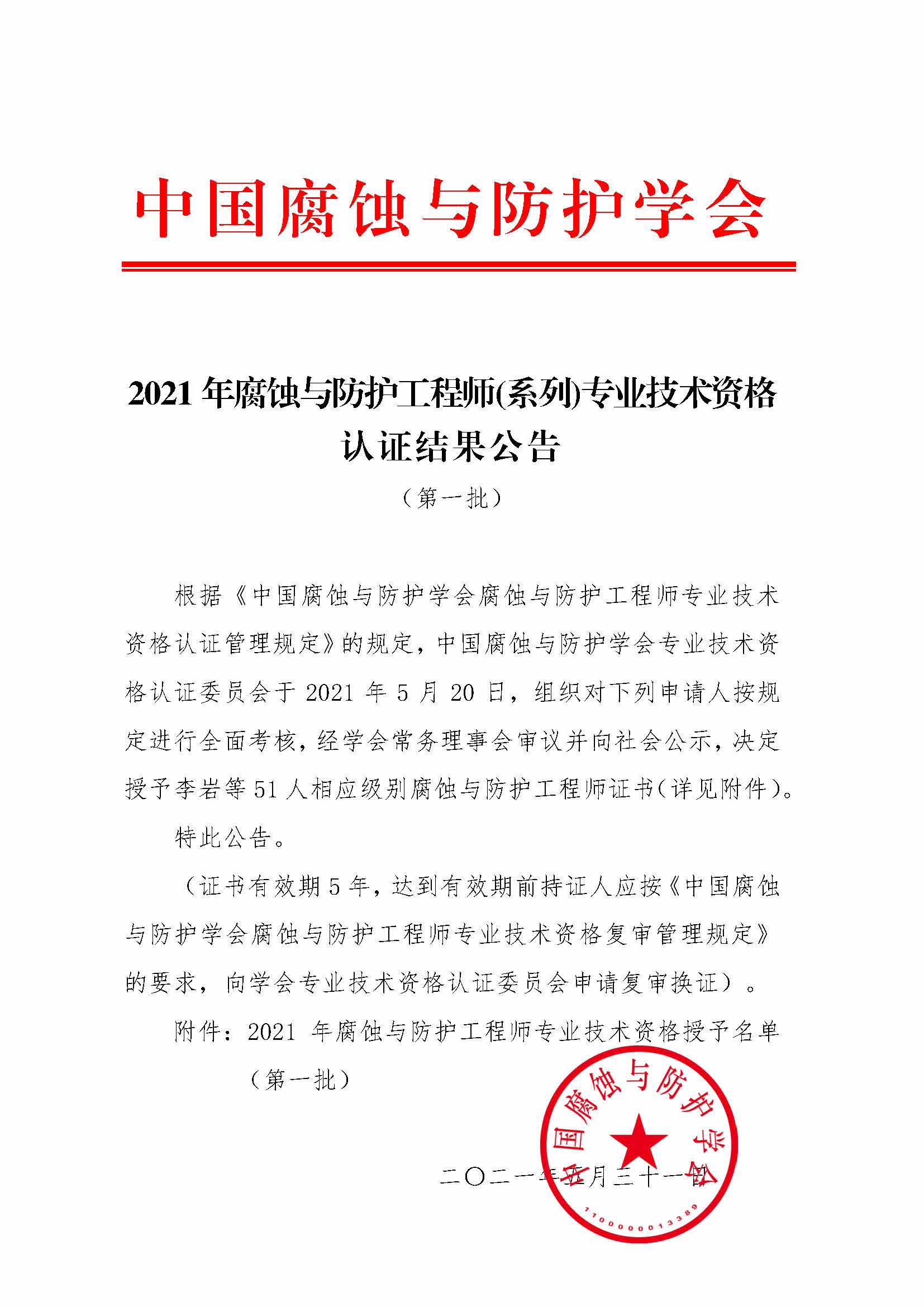 2021 年腐蚀与防护工程师(系列)专业技术资格认证结果公告