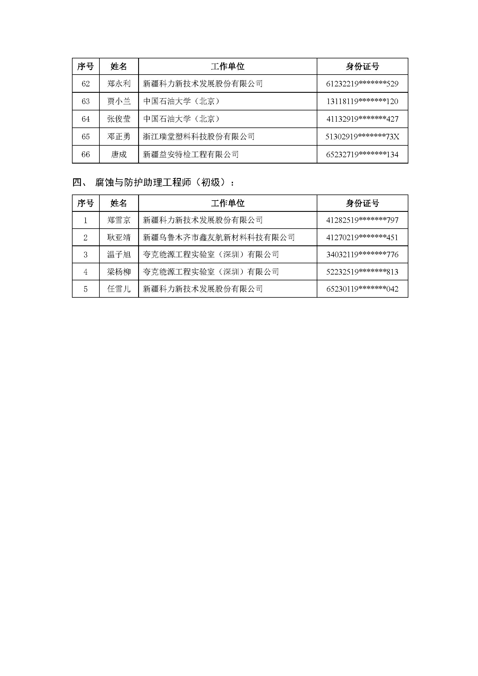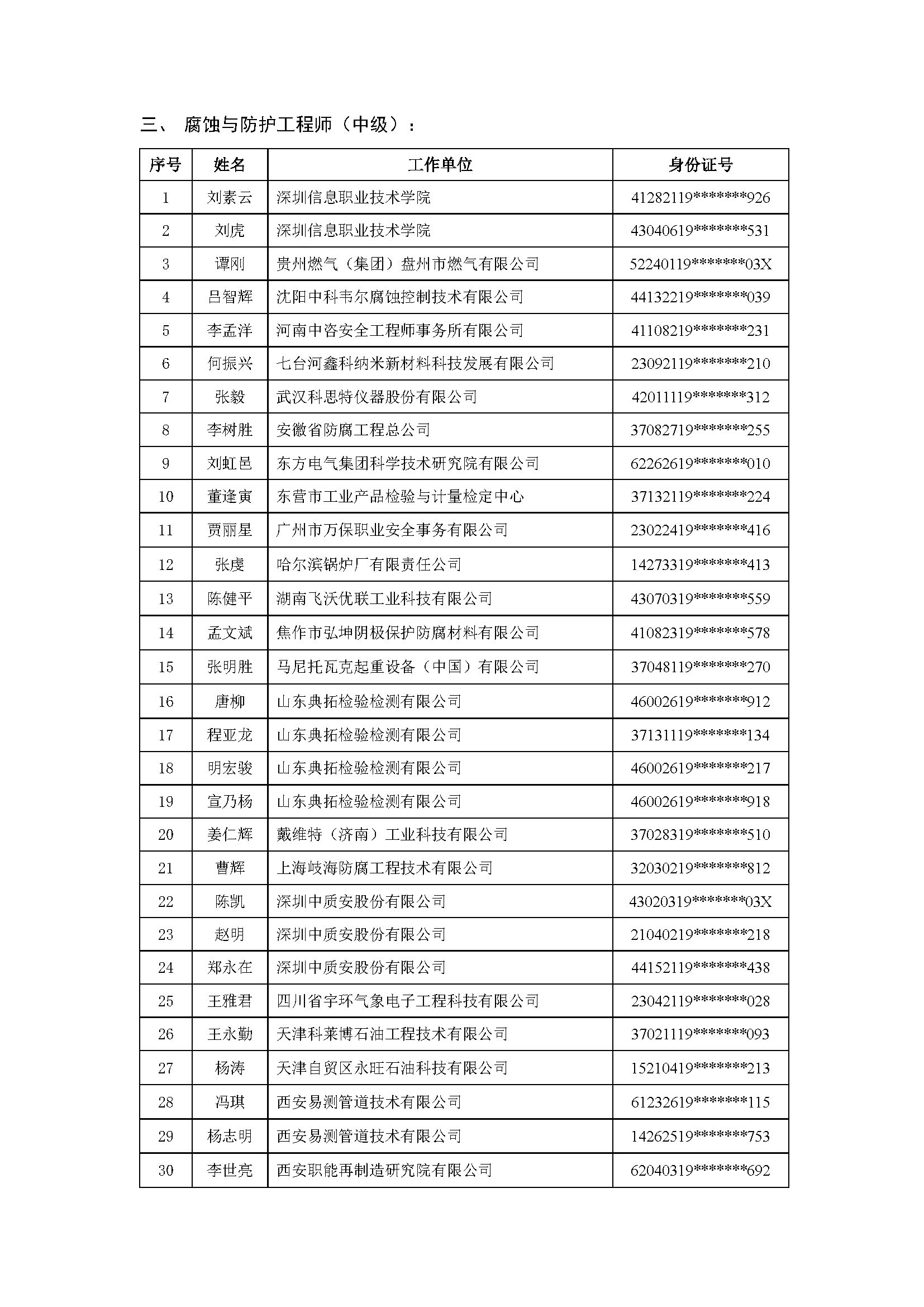 中国腐蚀与防护学会专业技术资格认证通过人员明细表(20