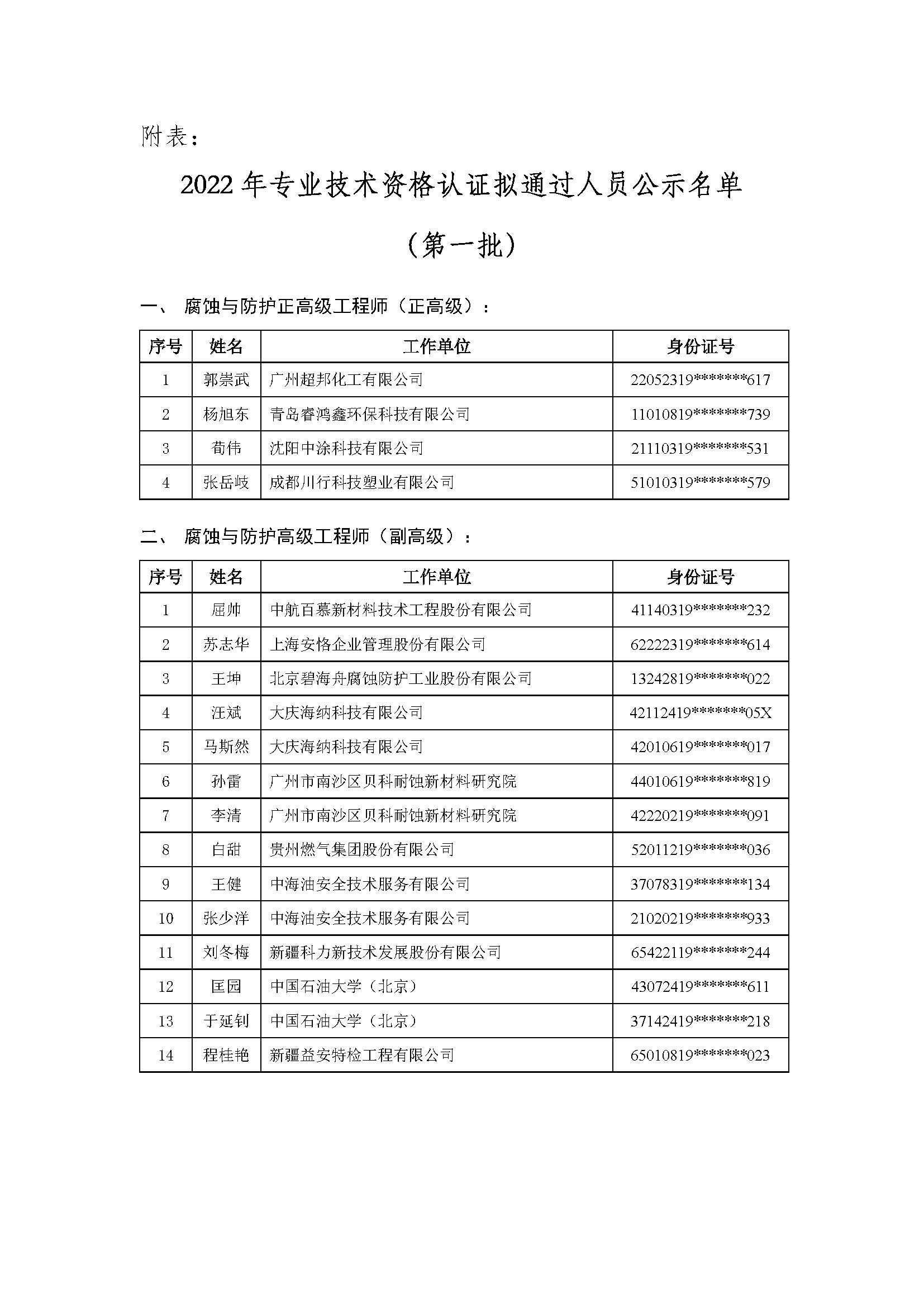 2022年腐蚀与防护工程师专业技术资格认证结果公示