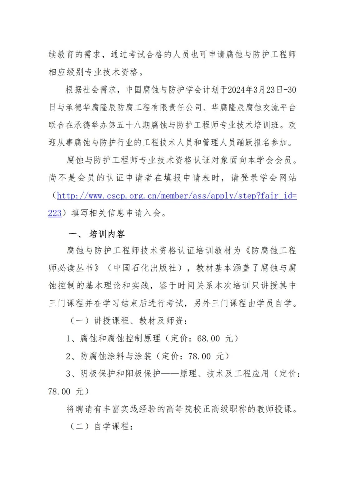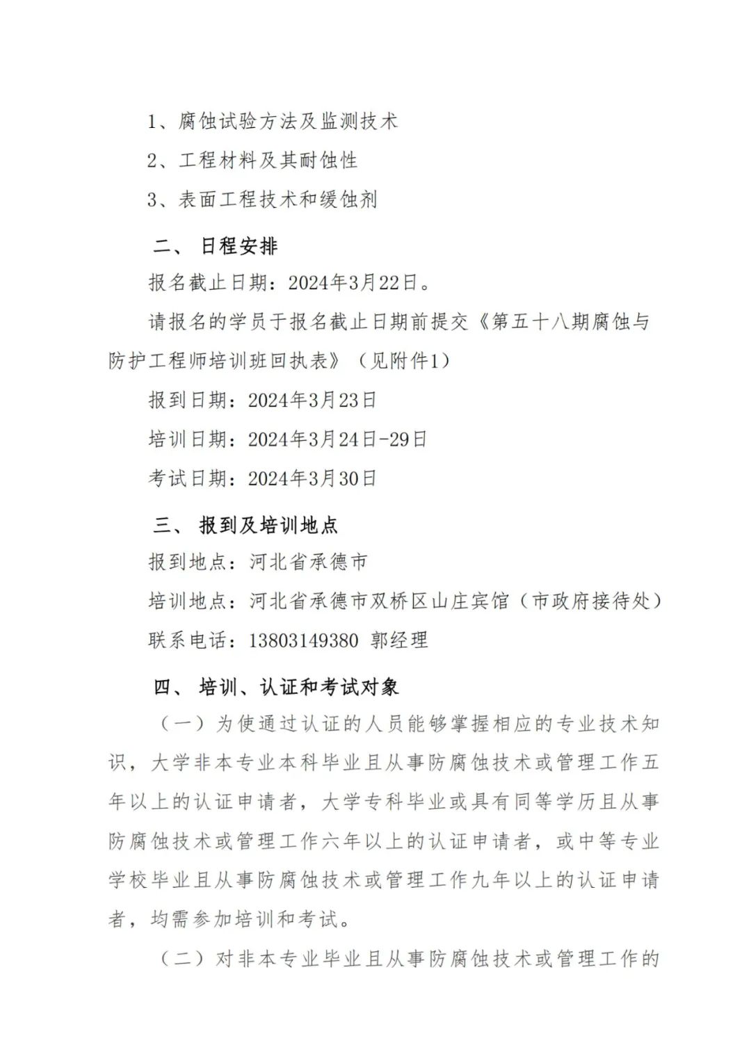 关于举办第五十八期腐蚀与防护工程师专业技术培训和考试的通知
