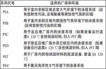 核电站是一个非常复杂的场所,不同区域对于防腐蚀涂料的要求也不尽相同。通常对核电站的不同部位要进行系统化的编号。核电站防腐蚀涂料的系列代号以及适用范围分别见表2和表3。划分的编号系统主要依据法国电力局EDF编制的《表面涂层规格书》No.91.C.031.05。