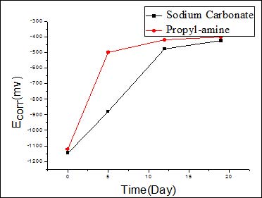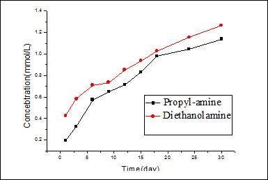 ⑵ 在碱性环境下,正丙醇胺与二乙醇胺对钢筋均有很好的缓释效果,当缓蚀剂浓度为0.08mol/l时,正丙醇胺缓蚀剂的缓释效率为93.01%,二乙醇胺的缓释效率为93.24%;