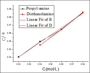 其中,C为缓蚀剂浓度,K为Langmuir吸附平衡常数。将Cθ-1-C作图(图6),从图中可以看出,Cθ-1-C呈较好的线性关系,正丙醇胺和二乙醇胺的线性相关系数R分别为:0.99462,0.99835,其斜率分别为:0.910,1.014。这说明正丙醇胺,二乙醇胺分子在钢筋表面的吸附符合Langmuir等温吸附模型,每个分子大约占据1.0个吸附点,是单分子吸附。通过拟合曲线所获得的截距而计算得到的Langmuir吸附平衡常数K分别为:83.333和232.558L/mol。