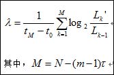 Wolf[9]给出了在一维数据中提取Lyapunov指数的方法。以初始点为基点V0,选取最近的点Vη0,构成初始向量,V0与Vη0间的距离可记为L0,取时间步长为t,初始向量沿轨线向前演化得到一新向量,其相应基点与端点间的欧氏距离可记为L1’,如此直至所有相点,然后取各指数增长率的平均值为最大Lyapunov指数估计值。#p#分页标题#e#