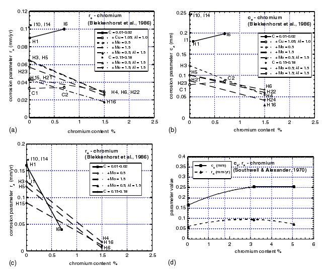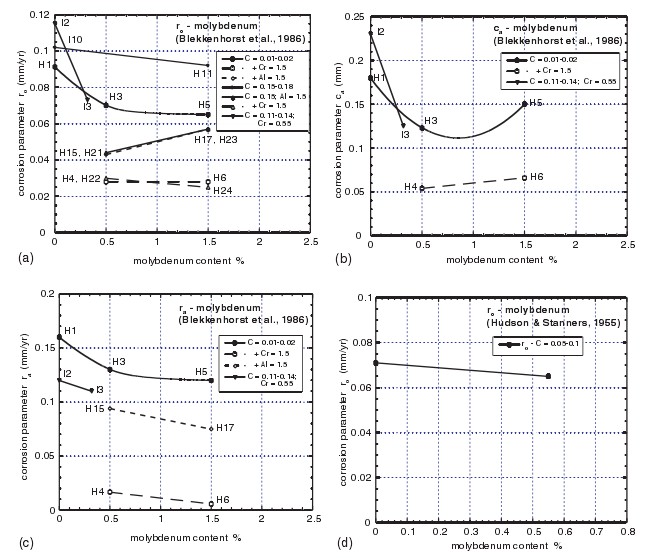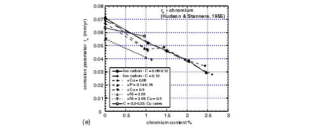 图2a中可以看出,Cr(≤2.5%)对非合金钢r0的影响效果很微弱,但是如果加入适量的Mo或Al,则很明显随着Cr含量增大,钢的r0减小,耐腐蚀性能现出增强。类似的现象在图2b也发生,但是随着Cr的增加ca的减小趋势随着Mo与Al的量起伏不定,并非2a图中那么明显,总之,ca受Cr影响较小;如期望相同,ra被Cr的量影响特别大,示于图2c。而cs,rs随Cr增加减小趋势的发生,则要求Cr含量增加到2%左右,但是虽有rs随Cr含量继续增加只会微弱下降。2e显示了不同化学组成的合金,腐蚀速率r0随Cr含量的增加减小的情况,综上可知,一定量的Cr对增加合金的耐腐蚀性是特别必要的,需要与其他合金(如Mo、Al)共同起作用,其含量值估计在2%-2.5%达到最佳。