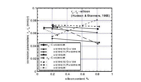 从r0曲线来看,Si的作用比较微弱但是轻微有效,rb表明Si对合金耐蚀性是有益的,尤其当同其他合金元素一起加入时。
