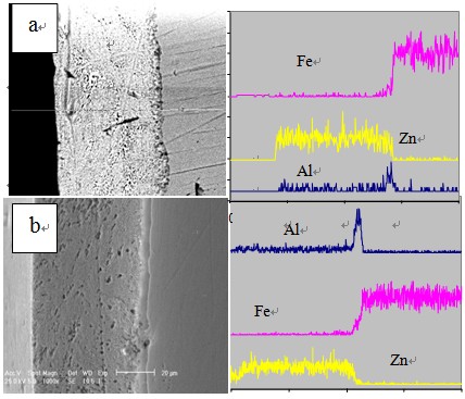 两者的镀层都分为明显的两层,但是没有经过电磁抹拭的过渡层较薄,经过电磁抹拭的过渡层较厚。没有经过抹拭的过渡层,分布在靠近基体0.1~0.3μm范围内,含铝量较高,没有脆性的锌铁合金层。而经过电磁抹拭的Galfan合金过渡层大约有1~3μm,铁元素随着距基体距离的增大,缓慢地逐渐降低,甚至在表面合金层也存在极少量的铁元素,锌元素成分的变化在过渡层中随着距基体距离的减小,逐渐降低。这是因为当钢丝从电磁抹拭装置引出时,电磁抹拭感应线圈相当对带有液态金属的钢丝感应加热,使钢丝表面温度升高,影响了钢丝表面元素的活性,铁元素更易于在过渡层中扩散,从而使得过渡层变厚。