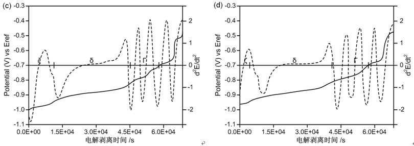(2)用电解剥离的方法在足够低的电位扫描速度下可以使热镀锌合金化镀层中的各相逐相溶解,利用测得的极化曲线和各相的初始溶解电位可以实现对镀层中各合金相的定量分析。