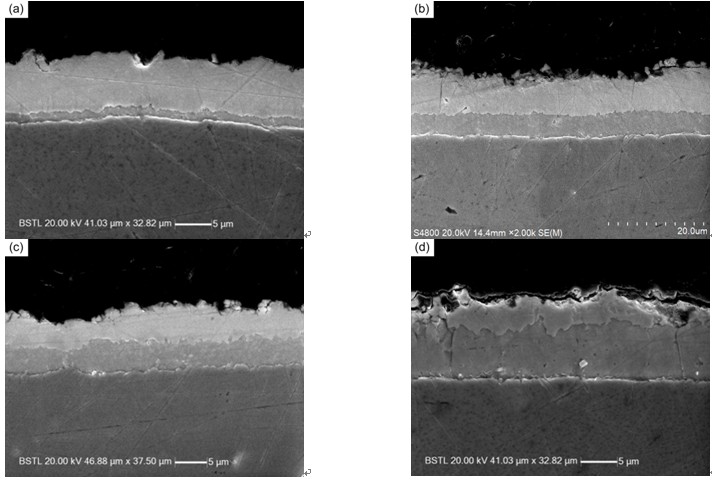 图3 工艺不同的热镀锌合金化镀层断面的SEM形貌 合金化时间:(a)10s,(b)30s,(c)60s,(d)180s