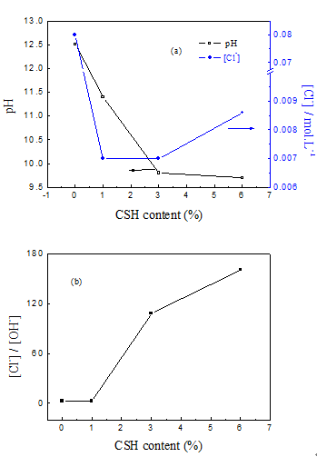 图1. 不同添加量(1%、3%、6%)的水化硅酸钙对pH=12.5孔隙液的影响. (a) pH值和[Cl-],(b) [[Cl-]/[OH-]值