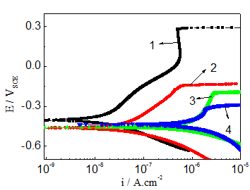 图7. 不同添加量的水化硅酸钙处理前后pH=9.7孔隙液中钢筋的极化曲线:1-0%, 2-1%, 3-3%, 4-6%