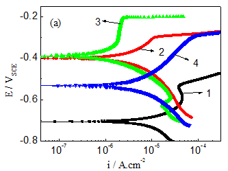 图2. 不同添加量的水化硅酸钙处理前后孔隙液(pH=12.5)中钢筋的极化曲线1-0%,2-1%,3-3%,4-6%