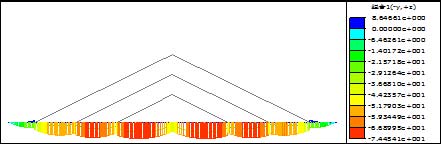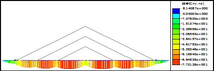 图2 初期(25年)钢箱梁下缘应力包络图(MPa)