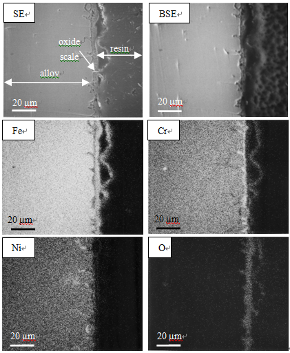 图11. 样品B氧化96 h后的截面形貌及元素面分布图
