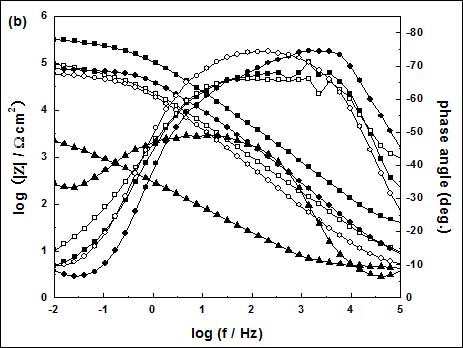 对于DT覆盖的铜电极,从高频至低频的压扁的大半圆形表明由于铜表面吸附DT,Rct成为主要控制因素。Bode图显示随着频率增加,log|Z|也增加,且斜率接近-1。从相应的相位角图可看出,在很宽的频率范围内,相位角始终保持在较高值。此外,Warburg阻抗消失。以上特征表明,在铜表面吸附的DT膜层十分致密,对铜起到了良好的保护作用。