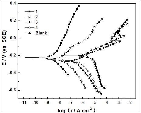 Figure 6. Polarization curves of bare copper electrode and DT-covered (curves 1 to 4) copper electrodes in 3% NaCl solution