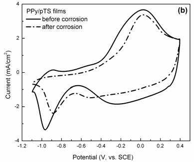 导电高分子材料具有金属和半导体特性、结构多样化、可逆的掺杂和脱掺杂、比重轻等优异的物理化学性能,因而在二次电池、超级电容器、太阳能电池、传感器、电磁屏蔽、隐身技术、生命科学、人工肌肉、分子器件、光/电子器件和金属防腐等领域有着广泛应用,自发现之日起就成为了材料科学的研究热点[1-4]。在导电高分子材料走向商业应用的进程中,首先需要关注和解决的关键问题就是稳定性,尤其是电化学活性的稳定。根据现代腐蚀理论 [5],腐蚀的定义不仅仅局限于金属材料,凡是材料受环境介质的化学作用而破坏的现象都可以称之为腐蚀,故导电高分子材料在外界环境作用下的降解老化、功能丧失也是一种腐蚀过程。#p#副标题#e#