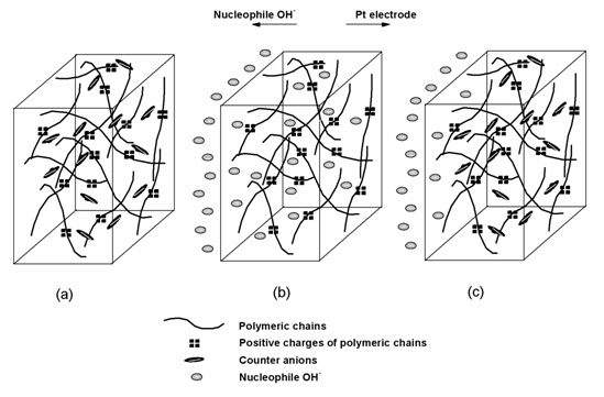 图5 不同聚吡咯膜降解过程结构变化示意图:(a)新合成聚吡咯膜;(b)掺杂小尺寸对阴离子聚吡咯膜处于碱性溶液中;(c)掺杂大尺寸对阴离子聚吡咯膜处于碱性溶液中