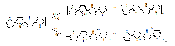 在诸多导电高分子中,掺杂聚吡咯(Polypyrrole,PPy)具有相对较高的电导率、良好的环境稳定性和优良的生物兼容性以及易于采用化学或电化学的方法合成等特点,被认为是最具商业前景的导电高分子材料之一,引起了人们的广泛关注。但稳定性是限制其商业应用的重要因素,尤其是聚吡咯的许多重要应用都是在水溶液中实现的,如人工肌肉、电极材料、催化剂载体、传感器等 [6]。一般认为聚吡咯发生腐蚀是由于其主链单元受到H2O、OH-、CH3OH、NH3等亲核基团的进攻而发生过氧化,导致共轭结构遭到破坏 [7],进而影响到其物理化学性质,尤其是电化学活性的损失,造成材料失效。