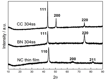 Figure 3. XRD patterns for CC 304ss, BN 304ss and NC thin film.