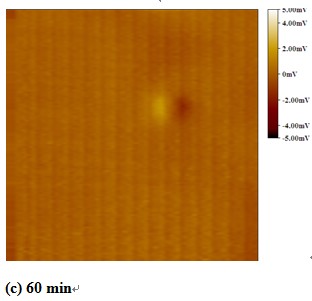 图1. NS-304SS样品浸泡在10%FeCl3溶液中不同时间的微区电位分布图: (a) 20min, (b) 25min, (c) 60min.扫描范围:4000μm×4000μm.
