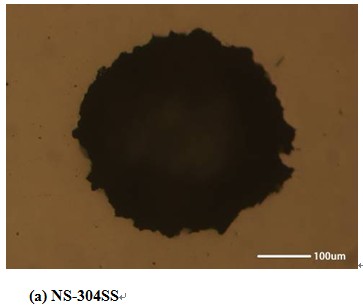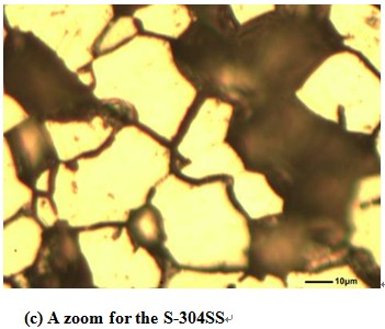 图3显示的是NS-304SS与S-304SS样品在微区电位分布测试结束后局部腐蚀活性区域的光学图片。从图可知,两者的腐蚀形态存在明显的差异,前者(图3.a)存在明显的腐蚀坑,且腐蚀坑周围的电极表面较为完整,未出现晶间腐蚀。而后者(图3.b)则存在多个腐蚀点,且腐蚀区域存在彼此相连、相互耦合的现象,这与微区电位分布得到的结果是完全吻合的。图3.c是图3.b的局部放大图,从中可看出,在不锈钢表面的晶粒周边,均出现腐蚀,也进一步说明S-304SS样品发生的是典型的晶间腐蚀。