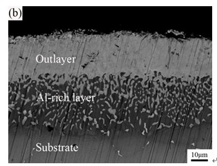 硅化物下面有一层是富Al层,由于Al元素在此区域的相对集中,相对来说更容易形成连续致密的Al2O3层。即使由于在氧化的过程中,由于氧化生成的TiO2造成的涂层氧化膜的脱落,富Al层也能很好的阻挡基体的被进一步氧化。