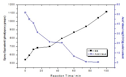 二步酯化工艺实现的关键点在于:在第一步酯化过程中,环氧树脂必须保留近一半未开环的环氧基,使之能在第二步酯化过程中与丙烯酸聚酯上的羧基发生环氧基开环酯化反应,生成复合树脂。若第一步酯化反应时环氧基开环过度,即环氧树脂上的环氧基团全部开环,则第二步酯化将无法进行,不可能将丙烯酸聚合物酯化到环氧分子链上去。