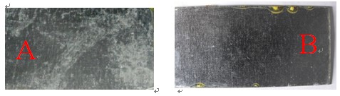图4 盐雾腐蚀测试照片(A)镀锌板,测试24小时后;(B)覆有改性清漆涂层的镀锌板,测试500小时后,涂覆厚度23微米