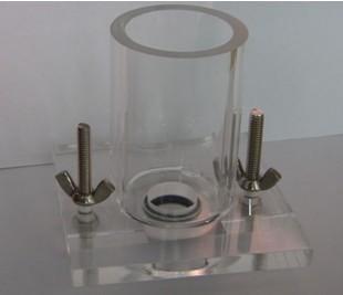 参照铁溶出值表征镀锡板的孔隙率的方法,铁溶出值最终的结果以每平方分米表面积上溶出的铁的微克数表示(μgFe/dm2)。为操作简便,需固定测试面积,本文设计并制造了铁溶出实验槽,见图3所示。槽的材料为有机玻璃,试片有效测试面为直径为2cm的圆。#p#副标题#e#