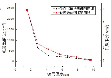 图5. 化学镀镍层孔隙率和铁溶出值随镀层厚度的变化曲线