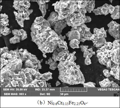 由图1可知,铁镍氧化物NixFe3-xO4颗粒呈不规则片状或花瓣状,并且表面有凹沟。铁镍铬氧化物Ni0.6Cr0.15Fe2.25O4锻烧后颗粒较大,呈草莓状,颗粒表面布满圆装小坑。上述形态与文献[5]报道结果类似。
