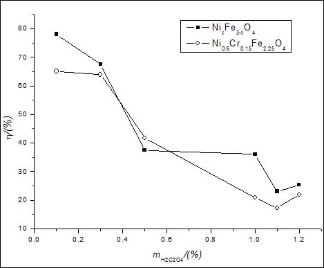 由图2可知,在0.1~1.2%草酸浓度范围内,两种氧化物的溶解率随浓度增加而减小。且草酸对铁镍氧化物NixFe3-xO4的溶解效果要优于铁镍铬氧化物Ni0.6Cr0.15Fe2.25O4。0.1%的草酸对两种氧化物的溶解率随温度上升而增加。60℃下,24h 内0.1%草酸对铁镍氧化物NixFe3-xO4和铁镍铬氧化物Ni0.6Cr0.15Fe2.25O4的溶解率分别为78.00%和65.10%。