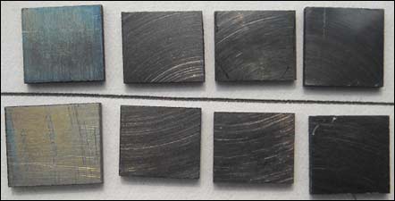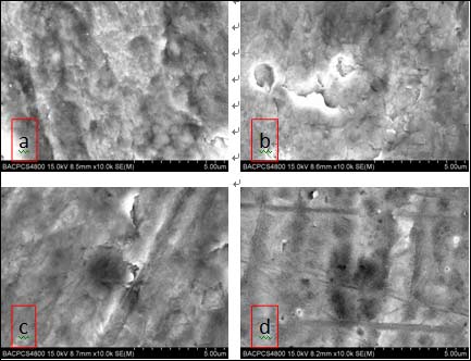 超声表面微纳米化加工的样品经350℃保温一小时后变成光亮黑色,而未加工样品表面呈很淡的浅黄色。为加深样品的氧化程度,随后在400℃保温一小时,样品颜色都有加深,但超声表面微纳米化加工的和未加工的样品表面颜色仍呈现明显差别,如图7所示,从左向右各列依次为未经超声表面微纳米化加工的样品和经2、4、8道次超声表面微纳米化加工样品的表面状况。在放大一万倍电子显微镜照片中,显现的是纯氧气氛氧化前样品表面特征,说明氧化膜均匀而且很薄,如图8所示, 其中a、b、c、d分别是经2、4、8道次超声表面微纳米化加工的样品和未经超声表面微纳米化加工的样品表面形貌。