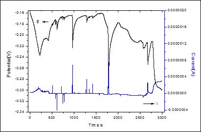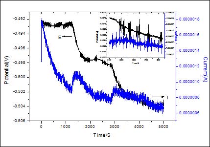 随着N80钢的电位噪声逐渐趋于稳定,表面的钝化过程基本趋于结束。在盛有NaHCO3溶液中加入4mol/L的NaCl,使Cl-离子浓度保持在0.5mol/L。