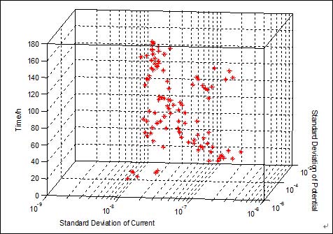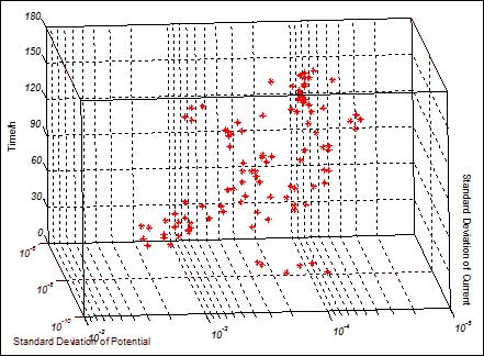 4、电流噪声标准偏差和电位噪声标准偏差的散点图可以判断点蚀所处阶段,时间轴上的三维统计图能直观地反映出点蚀的发展阶段,对于现场监测具有较大的指导意义。