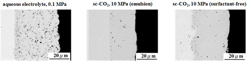 The surfactant addition in sc-CO2 containing electrolyte play an important role on the surface appearance of the deposits. When electrodeposition was performed in the emulsified sc-CO2 electrolyte, a flat and almost pinhole-free surface was observed.