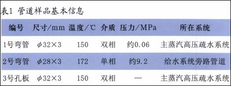本文选取了三个样晶进行分析:I号为疏水系统中的弯管,2号为给水系统中的弯管,3号为疏水系统中的孔板。比较I号、2号弯管,研究流速对于壁厚减薄的影响;比较1号弯管、3号孔板,研究管内流体状态对壁厚减薄的影响。三个管道样品材料均为20G优质碳钢,其样品尺寸信息和服役工况如表1所示。