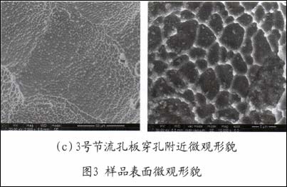 与1号弯管相比,3号节流孔板下游的弯管并未发生明显的壁厚减薄现象,说明节流孔板的存在确实可以降低流速、降低流体压力,从而避免管道发生因高速流体导致的冲蚀减薄。但是3号孔板自身出现了减薄穿孔,在损伤表面观察到的大量细微韧窝,说明材料表面的各细微局部均分别受到了外力的作用。
