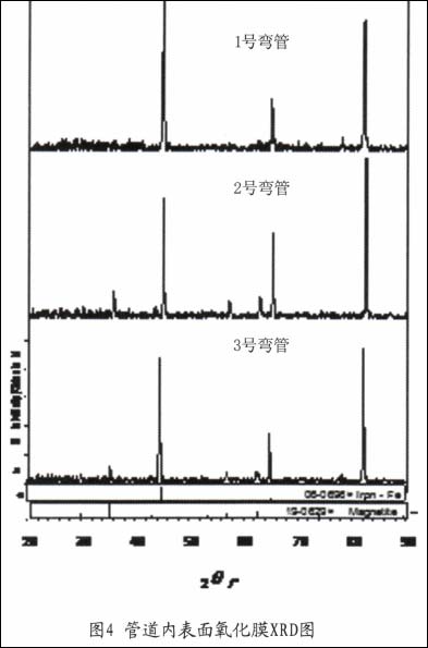对管道样品原始内壁的氧化膜进行了Ⅹ射线衍射分析,结果如图4所示。1号弯管内壁尽管呈黑色,但是氧化膜衍射峰中Fe304特征峰很低,说明表面氧化膜非常薄,证明其生成时间很短。2号弯管内壁检测到了中等强度的Fe304特征峰,说明该弯管表面氧化膜相对较厚,存在时间较长。3号节流孔板内壁检测出了较弱的Fe304特征峰,说明表面有氧化膜,但较薄。