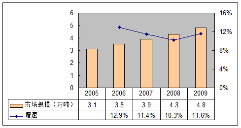 2005年我国气相缓蚀剂行业市场规模为3.1万吨,2006年市场规模为3.5万吨,同比增长12.9%。2007年市场规模为3.9万吨,同比增长11.4%。2008年市场规模为4.3万吨,同比增长10.3%。2009年市场规模为4.8万吨,同比增长11.6%。
