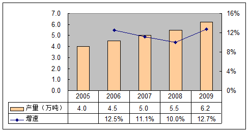 2005年我国气相缓蚀剂行业生产总量为4万吨,2006年生产总量为4.5万吨,同比增长12.5%。2007年生产总量为5万吨,同比增长11.1%。2008年生产总量为5.5万吨,同比增长10%。2009年生产总量为6.2万吨,同比增长12.7%。