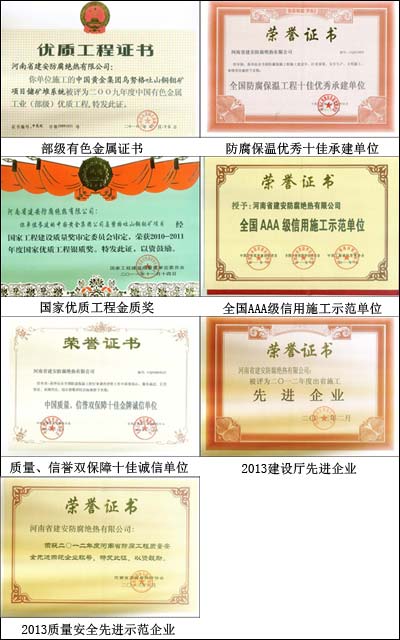 河南省建安防腐绝热有限公司创立于1985年,具有防腐保温工程专业承包一级资质;管道工程﹑建筑防水工程﹑炉窑工程﹑钢结构工程﹑防火涂料工程﹑建筑装饰装修工程﹑外墙外保温工程等七项二级资质;化工石油设备管道安装工程三级资质。公司于2001年通过ISO9001:2000质量保证体系认证,2005年通过ISO14001:2004环境管理体系认证和GB/T28001:2001职业健康安全管理体系认证。现有分公司、工程处、涂料厂、研究所等46个直属机构和88个分支机构。拥有员工3500人,有职称的工程技术和管理人员530人,其中高级职称34人,一﹑二级建造师68人;拥有包括10套3PE包覆设备在内的大、中型机械设备 1780台(套)。施工网点遍布全国30多个省、市、自治区,业务范围涉及石化、冶金、电力、军工、铁路、航运、市政等国家重点行业。是国内最具实力的防腐施工企业之一。