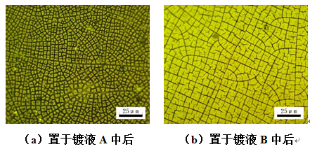为了研究裂纹的形成原因,以及三维结构的形成,分别将锌镍镀层置于镀液A(无还原剂且无硫酸镍)和镀液B(仅无还原剂)中,均在10min后取出,其表面金相图如图4所示。