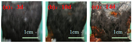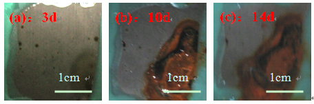 双层膜A在盐雾实验中的腐蚀变化如图6所示,图中(a)(b)(c)分别为放入盐雾箱3d,10d,14d后的腐蚀情况。可以看到,在3d时就已开始出现锈斑,但此时锈斑仍然很小。到10d时,锈斑迅速长大,占到总面积的30%。