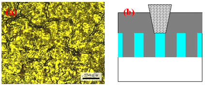 图7为盐雾实验两周后双层膜A的腐蚀照片及腐蚀模型。图7(a)中可以发现,双层膜表面发生破裂,露出下层的微裂纹。
