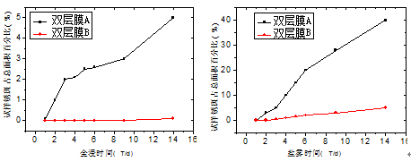 由图10可知,全浸实验中,双层膜B在两周内几乎没有红锈产生,而双层膜A在1d后就开始出现红锈,并且每天都有增加,不过占的比例很小,两周后才到5%。
