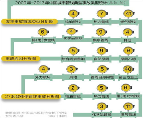 据统计,2009年-2013年直接因地下管线事故而产生死伤的事故共27起,死亡人数达117人。单就致死伤的地下管线事故而论,呈逐年增多趋势。其中2009年两起导致死亡,2013年则达到9起。其中,最易出事的是燃气管线。这些事故中,最严重的当属2013年“11·22”中石化东黄石油管道泄漏爆炸事故。